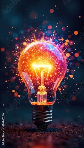 A lightbulb explodes with vibrant, colorful sparks, radiating energy and innovation, symbolizing brilliant ideas and creative breakthroughs , thinking, wisdom