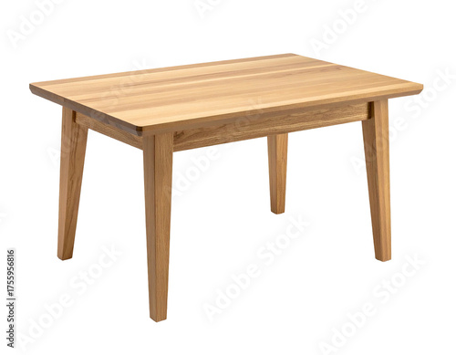A light-colored wooden table with a rectangular top and tapered legs, angled towards the ground