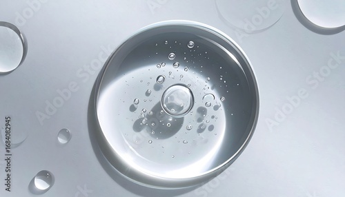 A light-filled, high-angle view of translucent liquid droplets and bubbles, showcasing a serene and elegant aesthetic.