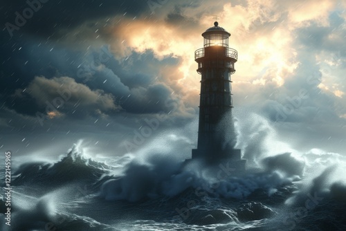 A lighthouse stands resilient against powerful storm waves on the North Sea as dark clouds gather and lightning lights up the turbulent sky