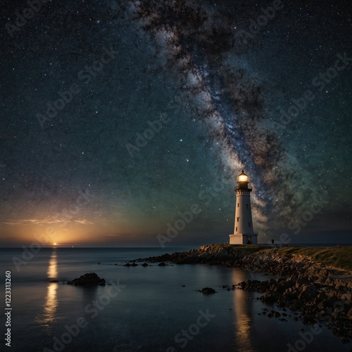 A lighthouse towers over a quiet coastal landscape, its beacon glowing softly under a breathtaking night sky filled with stars, with the Milky Way stretching across the horizon.