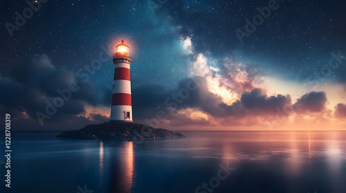 A lighthouse with red and white stripes rising against the majestic night sky. Generative AI