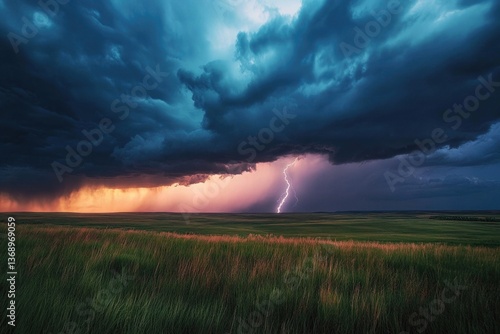 A lightning bolt hits the clouds, with white and gray stormy weather in the background