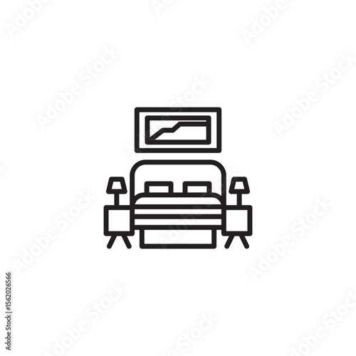 A line art icon of a bedroom scene with a bed, two nightstands with lamps, and a framed picture above the bed. It represents interior design or home furnishings.