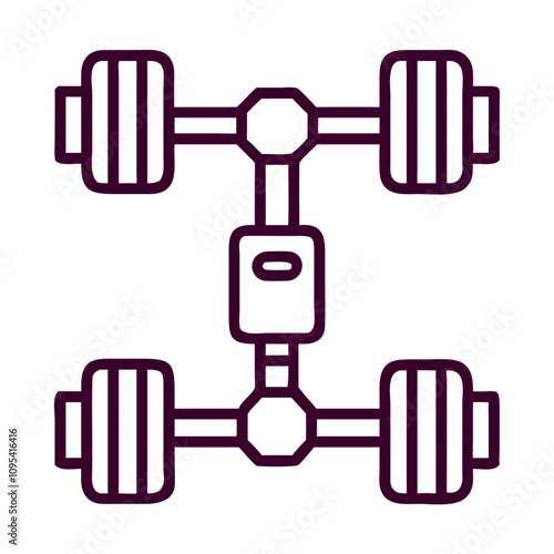A line drawing of a car's suspension system. The drawing is purple and features four wheels with a large bolt in the middle. The bolt is surrounded by a circle and a square