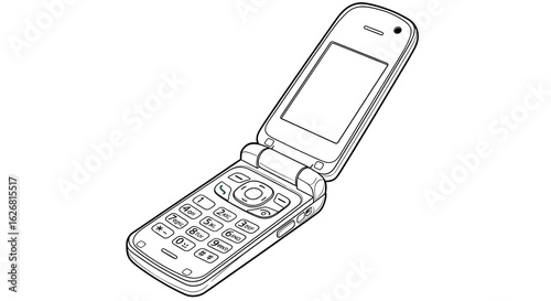 A line drawing of a flip phone with the screen open and buttons visible on a white background space