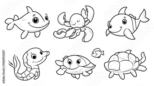A line drawing of various sea creatures, including a fish, dolphin, turtle, and crab, set in an underwater scene. The illustration conveys a lively aquatic environment.