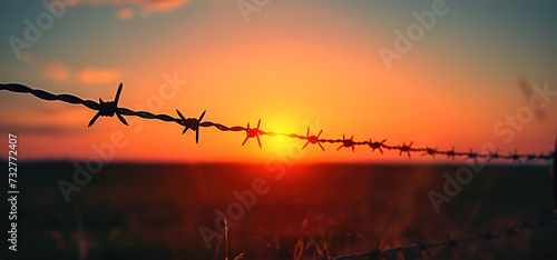 A line of barbed wire fencing, its silhouette crisp against the fading light of a setting sun. Generative AI.