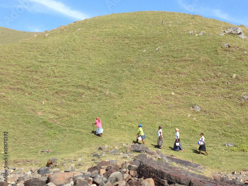 A line of women climbing the montain folowing their leader, green grass, colored clothes, sunny day, landscape