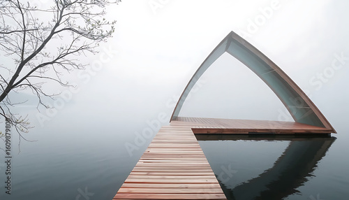 A linear wooden platform stretches into the lake, ending in a transparent shelter made of ghost glass.