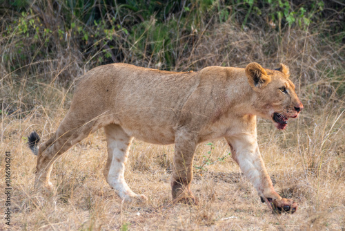 A lion cub is slowly walking through a vast field, Akagera National Park Rwanda