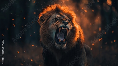 A Lion Roaring with a Golden Mane Against a Smoky Background