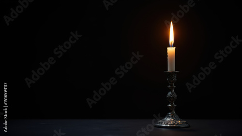 A lit candle on a table with an ornate silver holder.