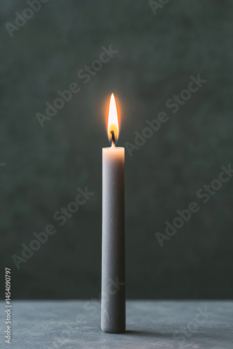 A lit candle stands alone, casting a warm glow against a dark textured backdrop.
