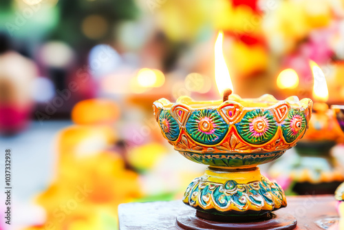 A lit lamp with rose petals scattered around on a wet surface. Copy space. Festive background for Diwali.