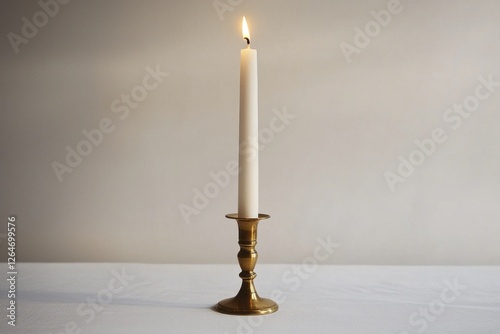 A lit white candle in a vintage gold candlestick, creating a warm and inviting ambiance, perfect for home decor or a peaceful, reflective moment.