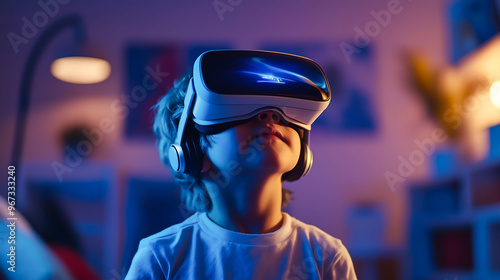 A little boy children having fun in virtual reality headset at home, playing online video game in world metaverse using innovative technology VR glasses exploring cyberspace