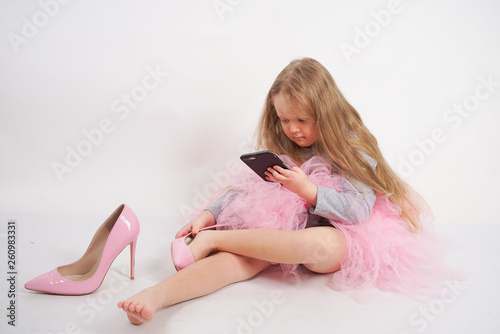 a little caucasian child girl sits and puts mother's high-heeled pink shoes, taking pictures of it all and selfies on her smartphone on white studio background
