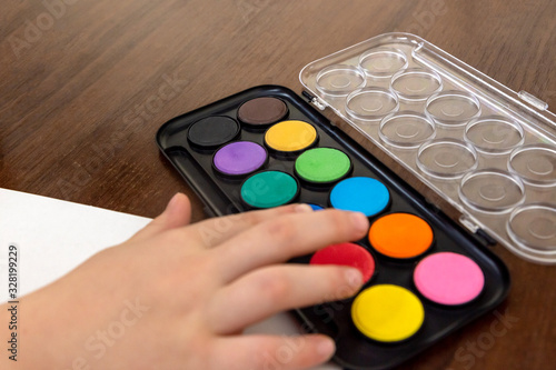 A little child girl hand is drawing by watercolor paints and her finger on a white piece of paper. The concept of creativity and learning of the child