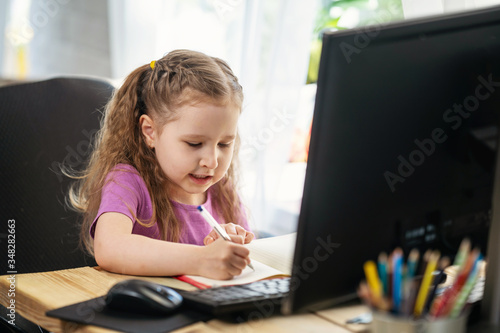 A little cute girl using computer for remote e-learning, , writes in a notebook