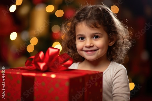 A little girl holding a red gift box. Generative AI.