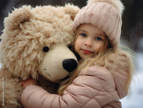 A little girl hugs a big teddy bear in the Winter Park