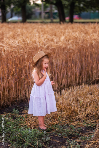 A little girl in a light pink sundress and a straw hat runs across a field of golden wheat and rye. Harvesting outside the city, walks in the countryside. Girl having fun in nature, agro tour