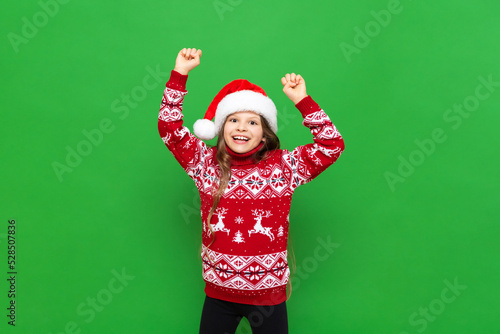 A little girl in a red sweater with reindeer and a Santa Claus hat waiting for the holiday on a green isolated background. The concept of Christmas.