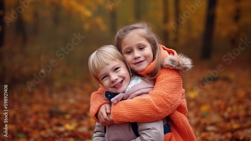 A little girl is cuddling her younger brother while grinning sweetly and enjoying herself amid a vibrant fall oak woodland. The Generative AI