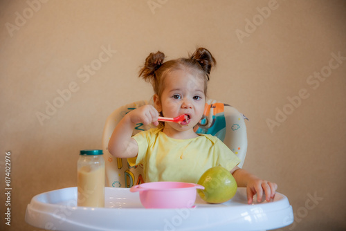 A little girl is sitting on a high chair and eating mashed fruit at home