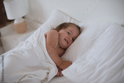A little pretty dark-haired toddler girl is lying in bed smiling and looking happy.
