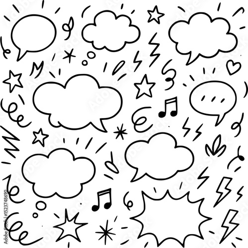 a lively and vibrant composition featuring an assortment of colorful handrawn speech bubbles in various shapes and sizes, scattered playfully on a clean transparent background