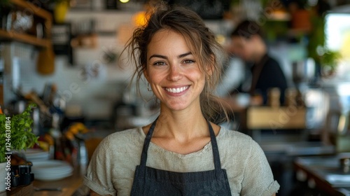 A lively atmosphere fills the air as a cheerful young barista serves customers in a charming cafe. Natural light streams in, highlighting her warm smile and vibrant surroundings filled with greenery