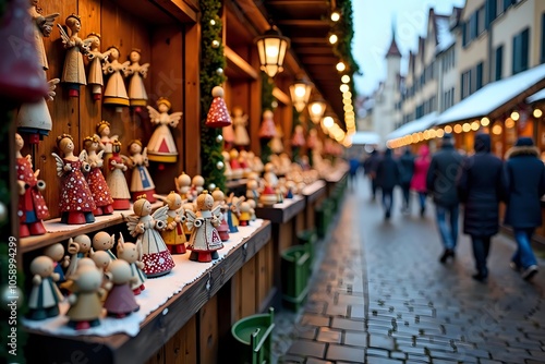 A lively Christmas market in Alsace with wooden stalls displaying vintage French ornaments, including hand-painted angels and tin soldiers, on a cobblestone street