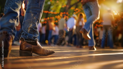 A Lively Cowboy Dancing at Outdoor Celebration with Friends, Sunlight Casting Warm Glow
