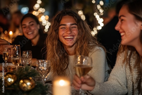 A lively dinner party where friends are sharing laughter, enjoying each other's company in a brightly lit atmosphere with festive candles and decorations.