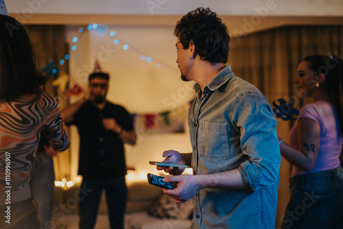 A lively gathering of friends celebrating a birthday in a warmly decorated living room, featuring party hats, colorful banners, and a cheerful atmosphere.