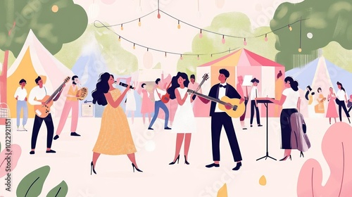 A lively outdoor music event with performers and an audience enjoying the atmosphere.