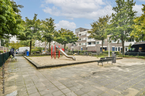 A lively playground features a red slide and surrounded by lush trees, offering a perfect outdoor space for children to play and explore.