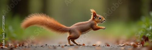 A lively red squirrel dashes along a forest path, capturing the essence of natures vibrancy and movement. Perfect for wildlife and nature-themed projects.