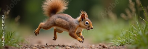 A lively squirrel leaps through a lush green setting, showcasing its agility and playful nature, perfect for wildlife and nature-themed projects.