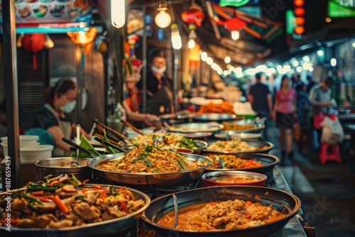 A lively Thai street food market at night, with vendors cooking and selling a variety of dishes