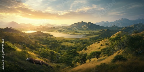 A lizard in a lush, mountainous landscape.