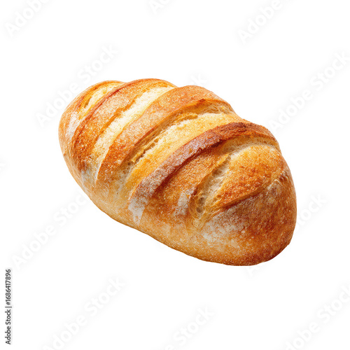 A loaf of artisan bread, light golden brown, with prominent diagonal scored lines