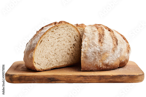 A loaf of bread, cut in half, on a wooden board, png, transparent