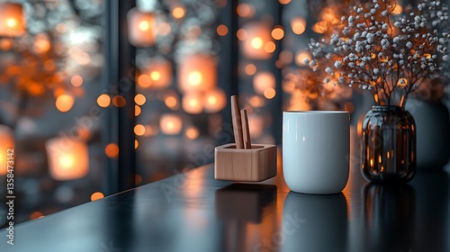 A LOFI cup with some pen and pen holder and some candles and flowers and lamp and beautiful light dark background