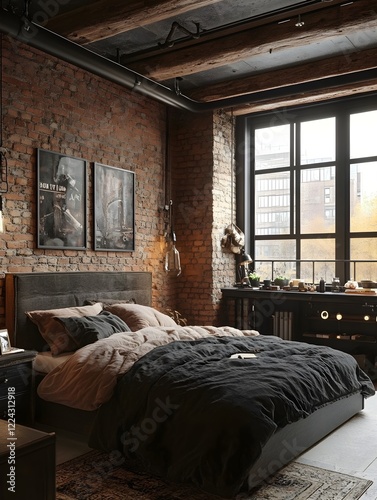 A loft-style bedroom with exposed brick walls and industrial decor.