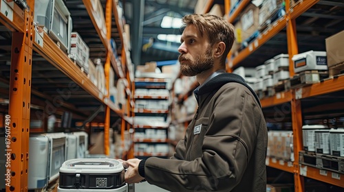 A logistics engineer programming a robotic system for warehouse automation. The technology enhances efficiency and reduces labor costs.
