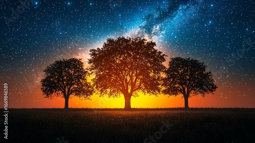 A lone ancient oak tree in an open field under a starry night sky, the Milky Way galaxy sprawling across the heavens.