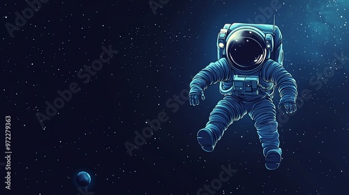 A lone astronaut floats in the vast expanse of space, surrounded by a sea of stars and a distant planet.